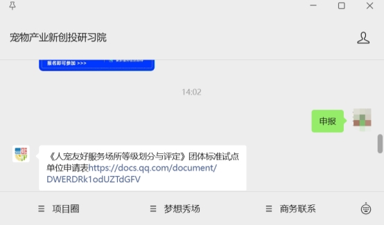 【宠物产业新创投研习院】 本公众号后台回复“申报” ,即可获取《人宠友好服务场所等级划分与评定》团体标准试点单位申请表 。