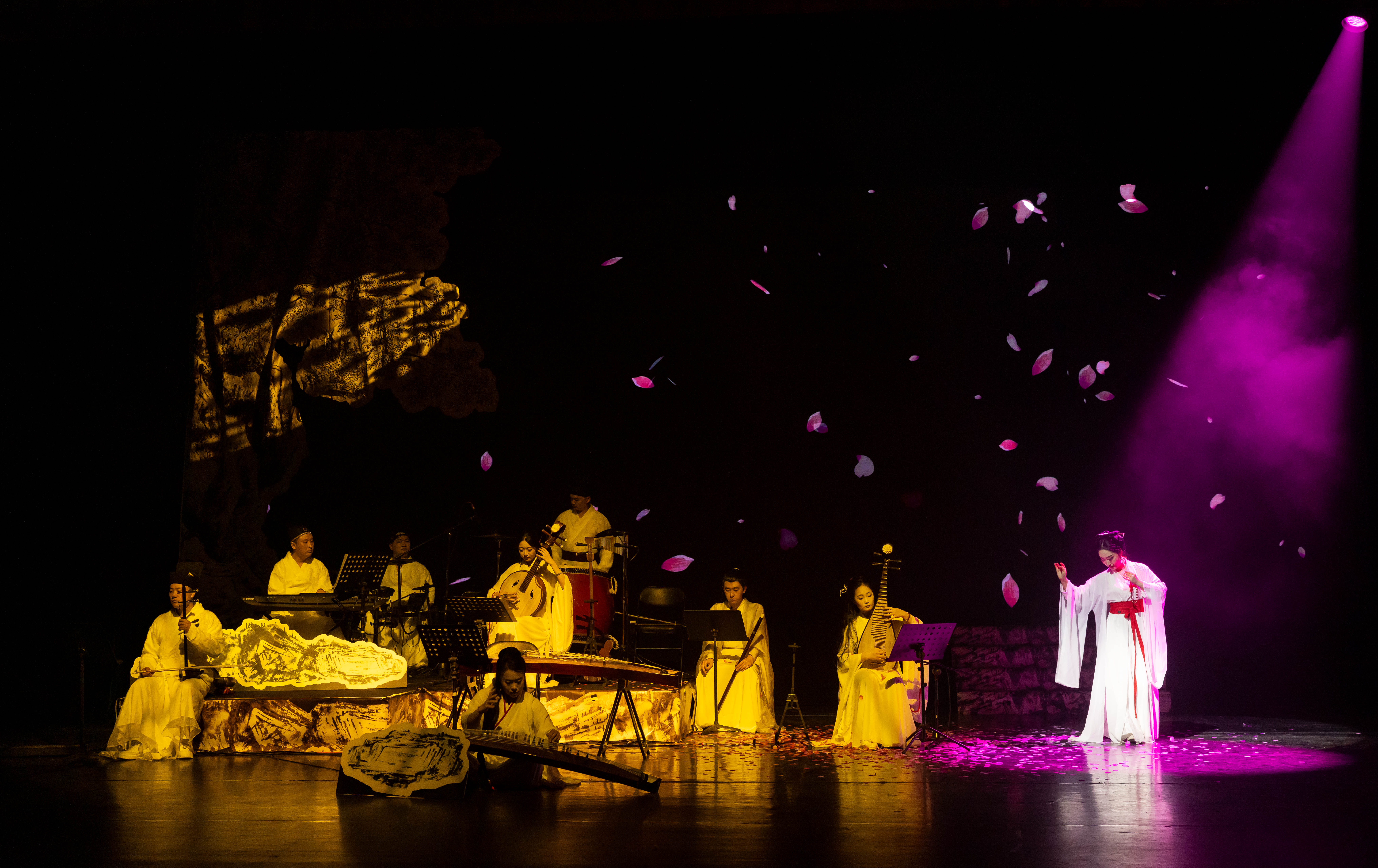 活动当天,伴随着悠扬的丝竹之声,国风音乐会《如梦令》在万众期待中拉开帷幕。《如梦令》情境音乐会,融合了民乐、戏剧、戏曲、舞 蹈、木偶、绘画多种表演形式,全剧没有语言却尽是言语, 无论音乐、演员、舞美、灯光、道具都在用自己的方式讲述着同一段故事,用不同的传统艺术表演形式深入挖掘中华优秀传统文化的精髓所在。
