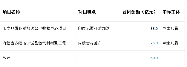 中国建筑于2026年3月31日发布公告称,公司近期新签两项重大工程项目,合同金额合计80亿元。此次新签项目分别为由中建八局承建的印度尼西亚雅加达普平数据中心项目,合同金额55亿元,以及内蒙古赤峰市宁城县燃气村村通工程,合同金额25亿元。按公司披露口径,上述项目金额合计约占其2024年度经审计营业收入的0.4%。