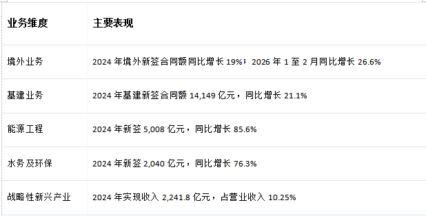 公开信息显示,中国建筑是国内较早开展国际工程承包业务的企业之一,业务覆盖亚洲、非洲、中东欧、北美、拉美和大洋洲等近百个国家和地区。经营数据方面,公司2024年境外新签合同额同比增长19%,2026年1至2月境外新签合同额同比增长26.6%,反映出其海外业务延续较快增长态势。