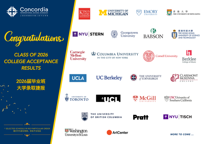 还有不到两个月,Concordia(上海协和国际外籍人员子女学校)毕业班的同学们即将踏上新的征程。截至目前,2026届毕业班的68位同学已经陆续收到来自美国、英国、加拿大、荷兰、德国、日本、中国香港等世界各地,大学的累计210多封录取通知书(斩获奖学金总计超100万美金),即将与他们的梦校双向奔赴。