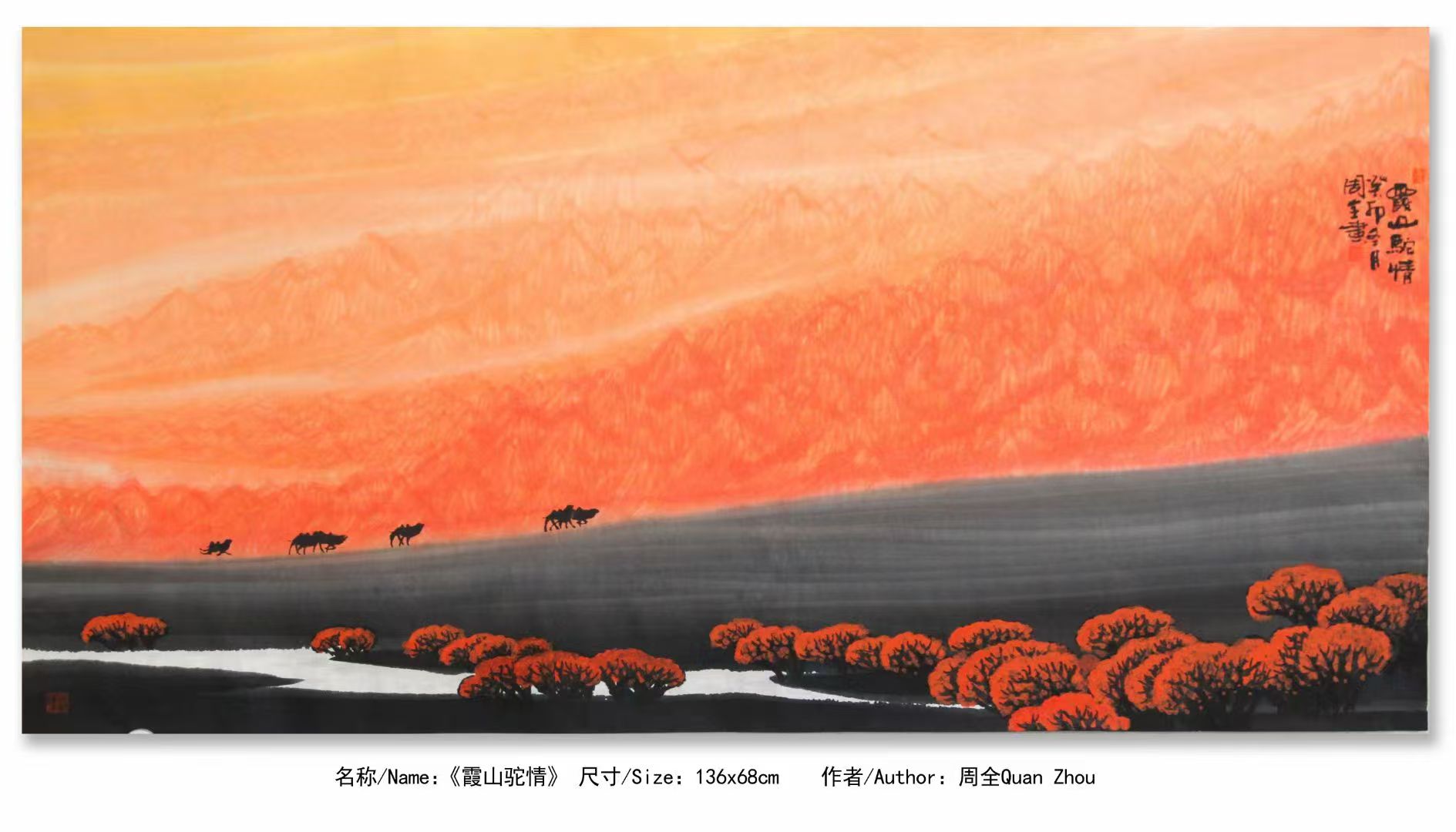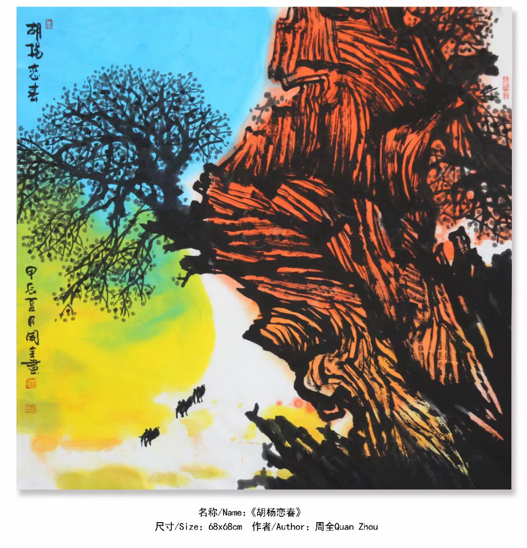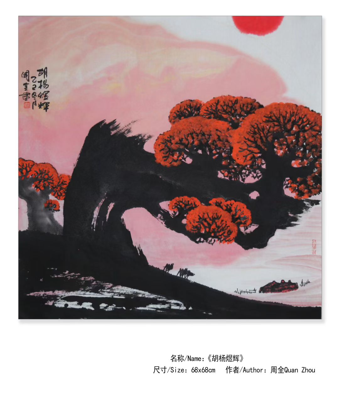 周全主攻西北大漠、昆仑、胡杨主题山水画,兼擅写意花鸟与人物创作。他的画作构图雄浑豪放、意境苍茫辽远,笔下戈壁无垠、昆仑巍峨、胡杨苍劲,将西北天地的磅礴大气与苍凉生命力展现得,,开创了独树一帜的大漠昆仑画派,成为当代西部山水艺术的标杆性人物。