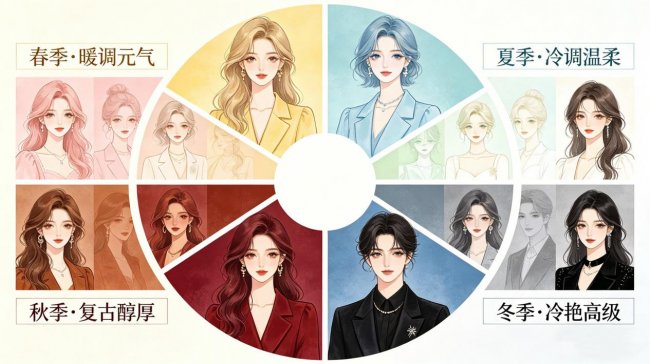 色彩从来都不只是视觉符号,更是无声的情绪语言。在韩式色彩体系中,人被分为四季色彩人格:春季暖调元气型、夏季冷调温柔型、秋季复古醇厚型、冬季冷艳,型。不同的色彩属性,对应着不一样的审美偏好与情绪需求。