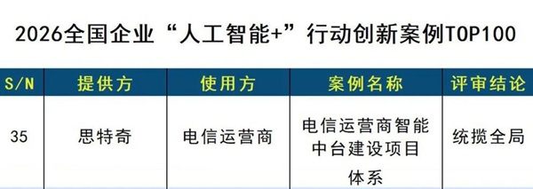 近日,由《互联网周刊》、DBC德本咨询联合发布的《2026全国企业“人工智能+”行动创新案例,00》榜单正式揭晓。北京思特奇信息技术股份有限公司(以下简称:思特奇)凭借“电信运营商智能中台建设项目”成功上榜,再次彰显了公司在运营商数智化领域的,技术实力与标杆引领地位。