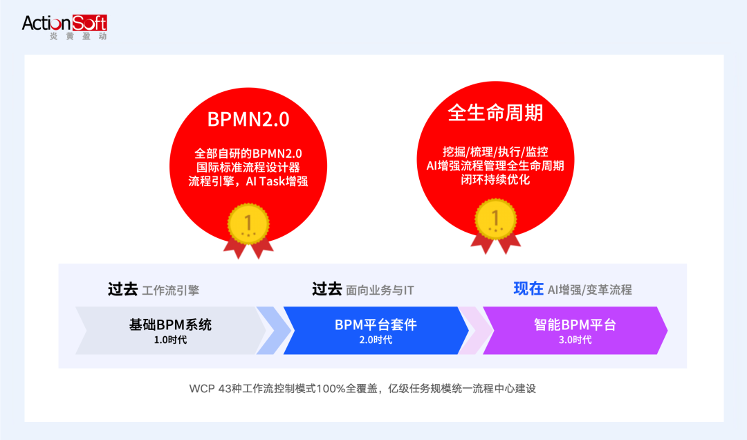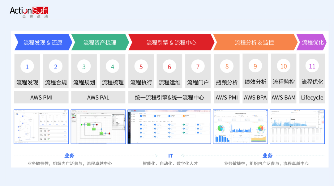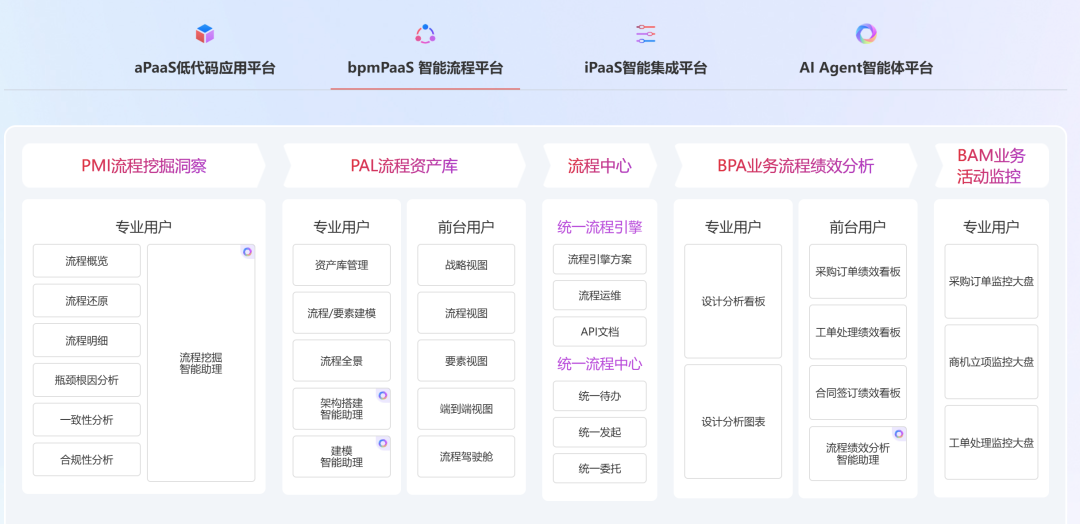 其,一代智能BPM PaaS平台涵盖了AWS PMI流程挖掘洞察、AWS PAL流程资产库、统一流程引擎、统一流程中心、AWS BPA业务流程绩效分析、AWS BAM业务活动监控六大核心组件,完整贯穿流程挖掘→梳理→建模→执行→监控→分析→优化全链路,AI 能力贯穿流程全生命周期的各个环节。
