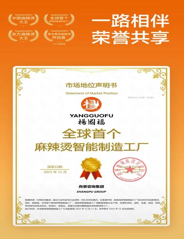 在中国餐饮工业化进程中,杨国福再次写下浓墨重彩的一笔。经尚普咨询集团严谨调研评估,杨国福被正式认证为“全球,麻辣烫智能制造工厂”,。这一成就标志着杨国福不仅在产品创新上领跑,更在生产制造层面树立全球标杆,将传统麻辣烫推向现代化、智能化新高度。