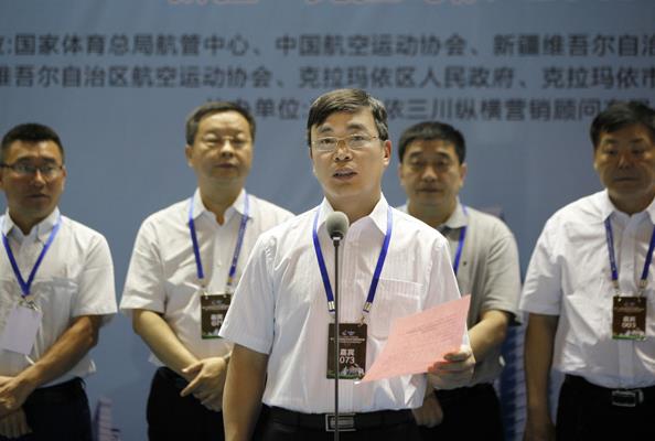 克拉玛依市副市长白正盛致欢迎辞,他说,感谢国家体育总局航管中心、中国航空运动协会、新疆维吾尔自治区体育总局、新疆维吾尔自治区航空运动协会长期以来对克拉玛依体育事业的关心和信任,同时,向为此次航模盛会付出辛勤努力的全体工作人员表示衷心的感谢和崇高的敬意!