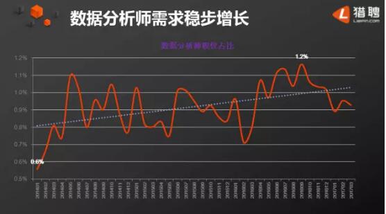 相比之下,在同一时段内,数据分析师的需求占比总体呈稳步增长态势,占比均值不断上升,并于2016年9月达到峰值1.2%,是2014年1月的2倍。