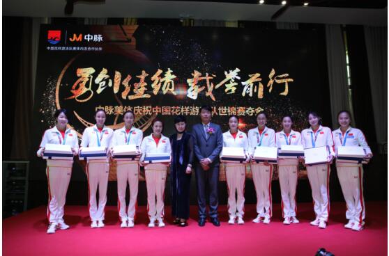 2017年8月25日,广州番禺,作为中国花样游泳队合作伙伴,中脉美体事业部为中国花样游泳队召开了庆功会,祝贺花游队首次摘得2017世界游泳锦标赛(以下简称世锦赛)集体自由组合项目冠军。庆功会邀请了中国花游队领队刘岩,教练郑嘉、金蝉以及队员蒋文文、蒋婷婷、梁馨枰、尹成昕、呙俐、汤梦妮、于乐乐等运动员共同庆祝,中脉科技美体事业部业务总裁邱伟杰、教育总裁温兆安等嘉宾出席现场,赠予花游队100万现金作为鼓励。