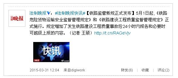 #法制晚报快讯#【铁路监管新规正式发布】5月1日起,《铁路危险货物运输安全监督管理规定》和《铁路建设工程质量监督管理规定》正式施行。规定增加了发生铁路建设工程质量事故后24小时内报告和必要时可越级上报的内容。