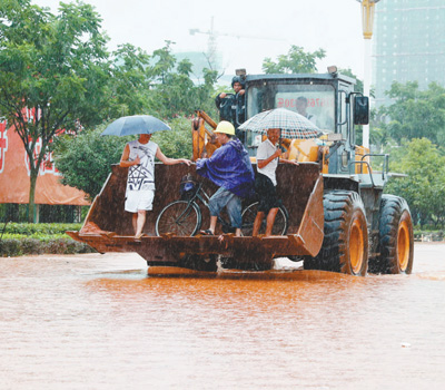 前不久,南方某地部分道路积水严重,一些市民乘铲车通行。 |