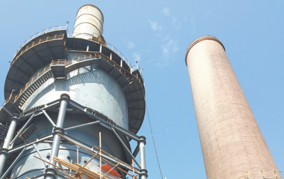 蓝天下,星原集团正在进行烟气脱白工艺改造。改造完成后,脱硫塔上将不再出现白色烟气。 |