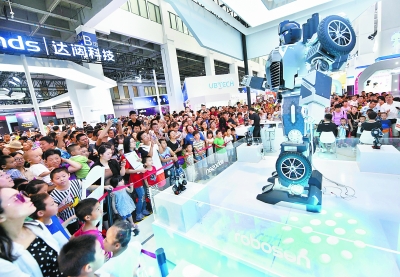 昨天,二○一九年世界机器人大会迎来,,,观众们抓住,的机会前来饱览高科技盛宴。图为家长们带着孩子正在欣赏变形金刚机器人跳舞。本报记者 和冠欣摄