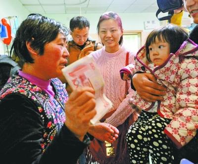 一位家长抱着孩子送来捐款。记者胡伟鸣 摄