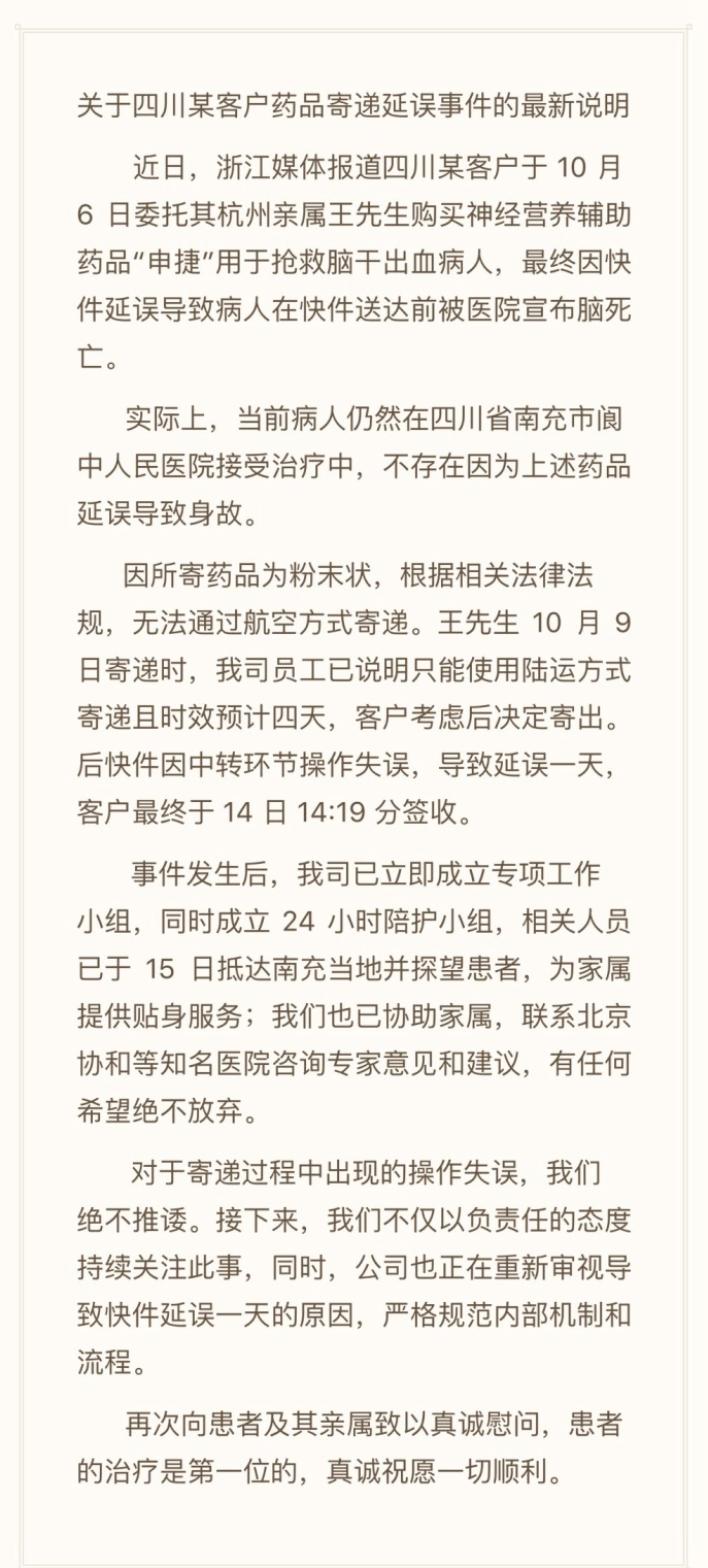 10月15日有媒体报道称,杭州的王先生亲戚因脑干出血入院,后委托王先生在杭州购买“申捷针”用于抢救治疗,但药品于10月9日通过顺丰速运寄出后,直到14日药品才抵达四川省南充市,而病人已于13日被宣布脑死亡。