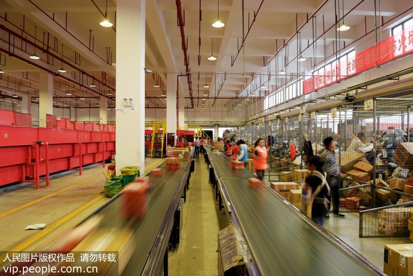 11月15日,在贵州快递物流园某快递公司贵州转运中心,工作人员在分拣快递包裹(龙毅/人民图片)
