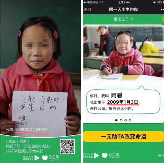 人民网北京12月23日电(记者贾兴鹏)今日,网友们又被微信朋友圈里一个“公益活动”刷屏,大概意思是,寻找和自己同,出生的山区贫困小朋友,然后捐助1元钱给对方助其改变命运。