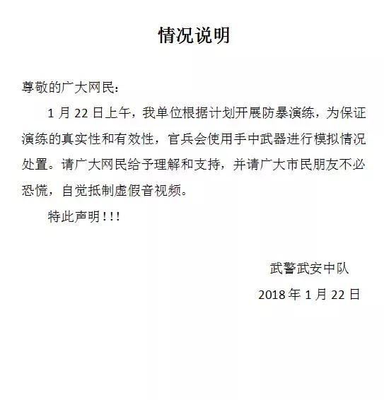 人民网1月24日电 (孝金波 王亚静)1月22日,“武安看守所一杀人犯越狱了,带着枪,都注意了”的消息在网上传播,并配有视频,引起网民关注。1月23日,邯郸网警回应,经核实,网传消息系谣言,视频内容实为武警中队开展防暴演练。