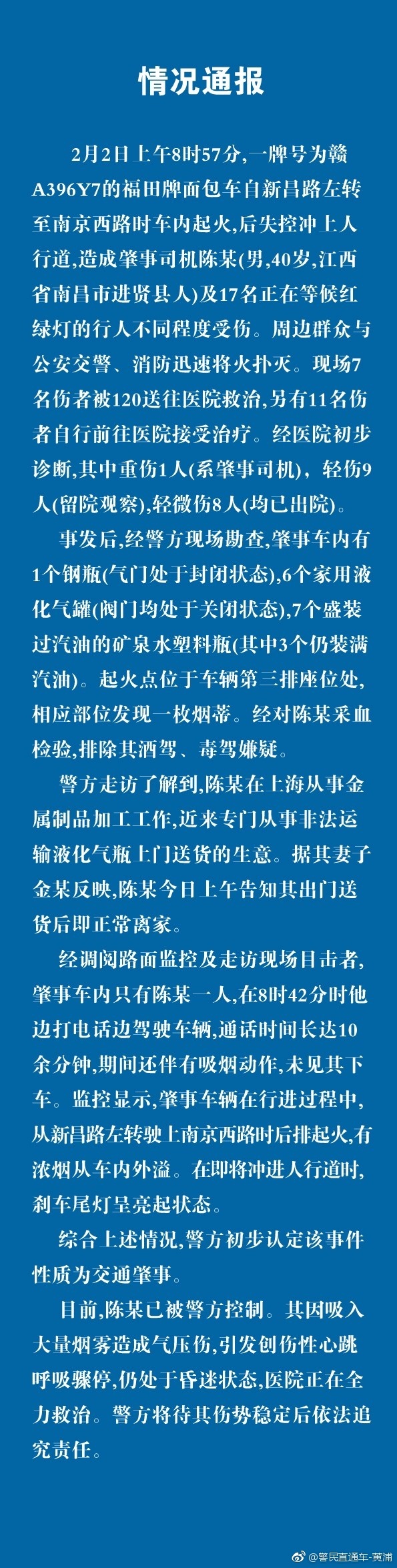 上海通报"面包车冲上人行道":司机重伤 排除酒驾毒驾