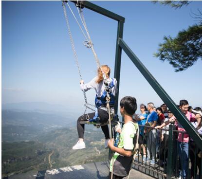 刘洋表示,这座悬崖秋千长4米,就修建在悬崖边,游客来体验时,将被绑着安全绳的工作人员荡出悬崖,以180度的角度飞出去。