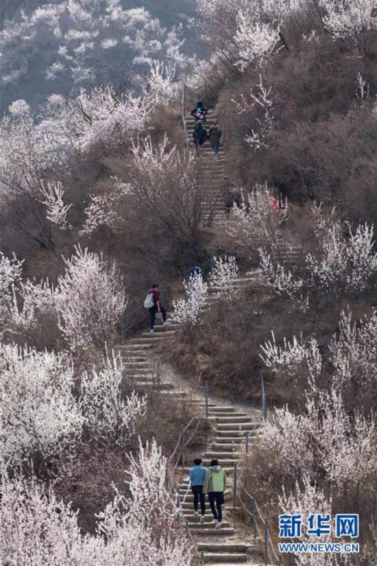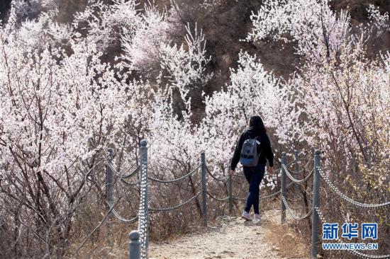 3月30日,游人在北京京西古道景区游览。近日,位于北京西郊的门头沟区京西古道景区漫山遍野的山桃花盛开,吸引游人前往赏花踏青,感受春天的芬芳。 新华社发(侯继庆 摄)