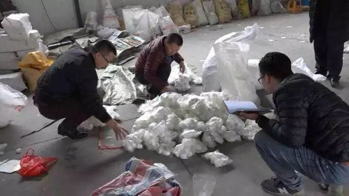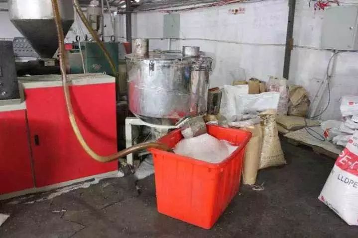 锁定目标后,今年1月25日,收网行动正式开始。民警突击进入厂区内,发现厂内一台塑料挤塑机还在轰鸣运作,除了一条完整的加工生产流水线,还有假的合格证和防伪条形码贴在其中,旁边还堆放着数袋回收来的废旧塑料和已粉碎好的塑料。厂区内外都堆满了四五米高的假冒管材。