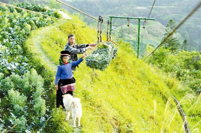 为了克服山区耕地少、坡度陡、修建机耕道难等问题,当地村民与合作社一起,在蔬菜基地的陡坡上修建了5条索道。种菜时,村民们用索道把生产工具、农家肥等从半山腰运至山脚;收获时,再用索道把蔬菜从山脚“快递”至半山腰的公路旁,由收购商“订单收购”后统一装车外运,既方便又快捷,大大节省了人力,节约了运输成本。