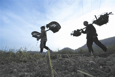 4月8日,排调镇党早村村民从蔬菜种植示范基地劳作归来。