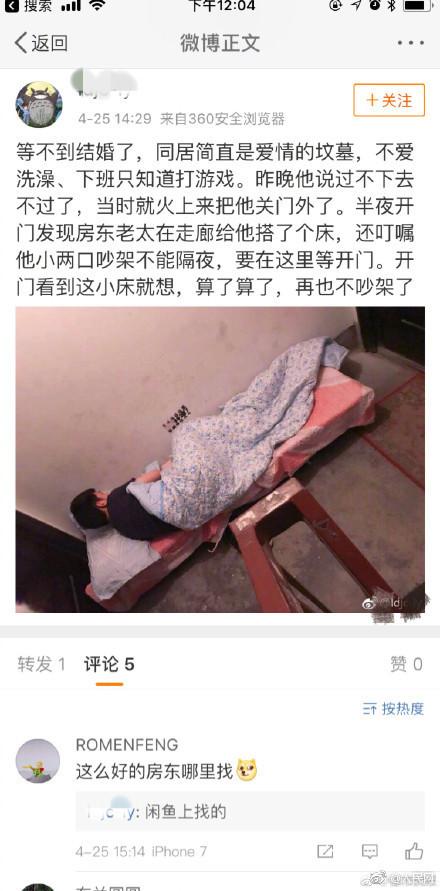 【情侣吵架男友被关门口过夜,房东老太在走廊搭床:小两口吵架不能隔夜,等她开门】浙江一女网友发微博称,她和男友时常吵架,一晚把男友关在门外过夜,不料房东老太给男友在门口搭了个床,还叮嘱说:小两口吵架不能隔夜,在这里等开门。网友:这枕套被套很复古啊,这样暖心的房东哪里找?