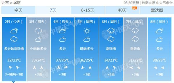中国天气网讯 本周,北京的总体天气为雨水、高温交替出现。预计今明天(2-3日),部分地区有雷阵雨或阵雨,,气温32-33℃。周三、周四伴随着雨停,将再现高温天气,,气温升至36-37℃;周五、周六雷阵雨再度光临,气温跌落至31-34℃,公众需关注临近预报,携带雨具。