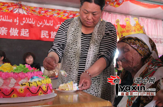 亚心网讯(通讯员 蒲丽华 牟东明)5月5日,平时里安静的尉犁县阿克苏普乡农民手工业培训基地传来热烈的掌声,115岁高龄的维吾尔族老妈妈萨尔汗·肉孜品尝到汉族结对户60岁孙满玲亲手喂的鲜美的生日蛋糕和长寿面。原来,这天,尉犁县阿克苏普乡妇联精心准备好礼物和节目,邀请该乡120名民汉母亲结对过“母亲节”,这个意外的母亲节,让老妈妈们喜极而泣。