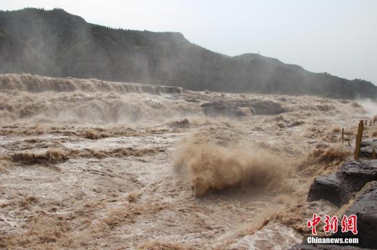 近日,黄河壶口瀑布水量大增,湍急的水流携带大量的泥沙奔涌而下,主瀑布几乎没有落差,出现“水岸齐平”的景象。 阿琳娜 摄
