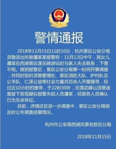 谭妈妈告诉记者,,发现女儿失联的是她的同学,“13日下午,我女儿约了同学一起吃饭。当时她和同学说在灵隐景区,玩好了再去见面吃饭。但是之后女儿同学就联系不上她了。他们也没有我的电话,还特意去学校找到了我老公的电话,这才联系上了我们。”