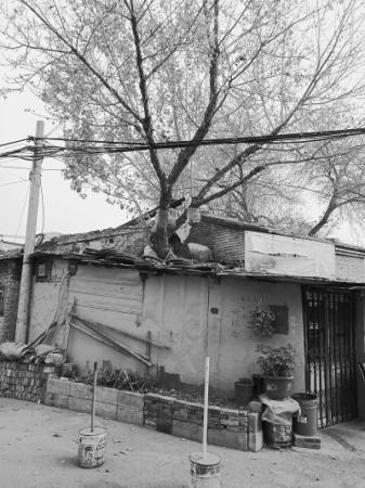 通过南侧围挡的缝隙,记者看到拆除后的废墟周围有几间窝棚似的旧房子,房顶上盖着瓦楞板、油毡、防雨布,并码放着方砖进行加固。空地上堆着一些破旧家具、加工食品的推车以及各种生活杂物。废墟中间有几栋拆了一半的二层小楼,房顶和门窗全拆走了,只剩下残垣断壁,周围散落着砖块瓦砾。一棵小树从破房子中冒了出来,已经长到2层楼高。杂草在窝棚间疯长,冬季风干物燥,枯黄的杂草很容易引发火灾。