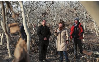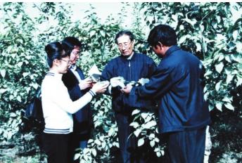2003年12月9日,塔大园林系教授闫春雨(右二)在果园进行现场教学(资料片)。