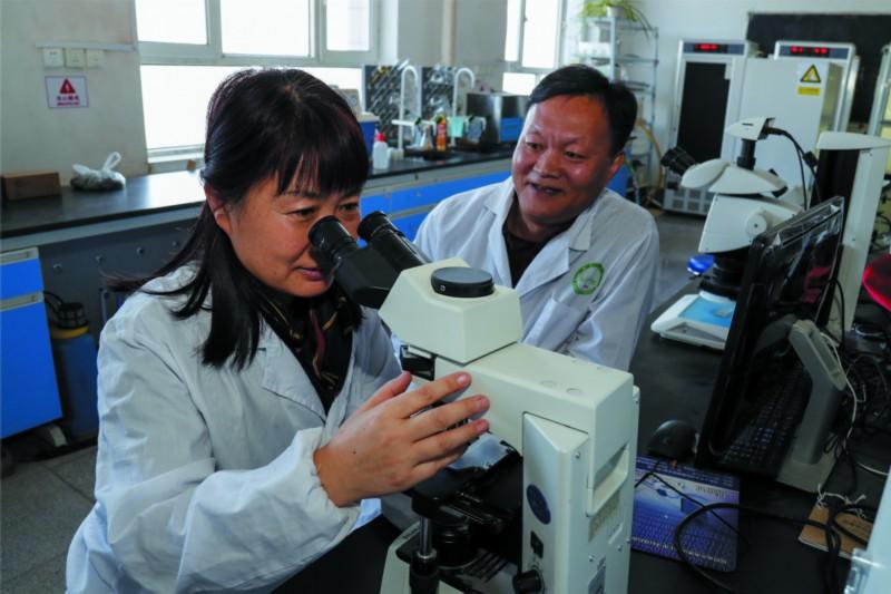 12月14日,王兰(左)与冯宏祖查看实验结果。夫妇俩均是塔里木大学植物科学学院教授,从教26年来,培养了近50名硕士生、博士生。