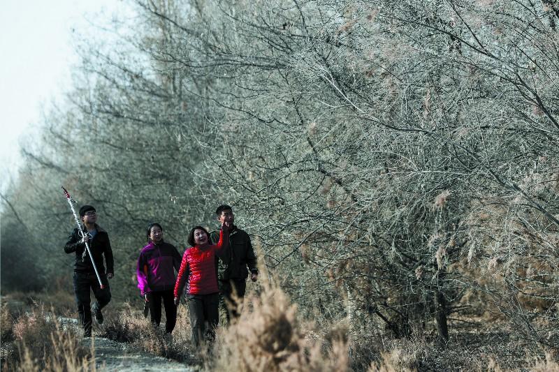 12月14日,塔里木大学生命科学学院教授李志军(右二)在学校附近的实验林里,带学生查看胡杨的生长情况。有人说,塔大师生的身上总有一股泥土味、羊粪味、牛粪味,这恰恰是群众对他们,的褒奖。