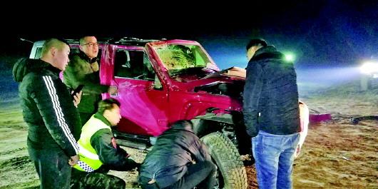 2018年12月21日,一位车主开着新买的越野车来黄河滩试车,结果却发生翻车事故。由于从大坝到出事的黄河大滩有二三百米的路,坑坑洼洼还有陡坡,相当难走。志愿救援队的胡师傅和几位队友先将翻车的越野车损坏的右前轮卸下换上备胎,然后用一辆越野车拖着,其余车前后护送着,费了好大劲才将事故车拖到大坝上,交由救援,的平板车运走。
