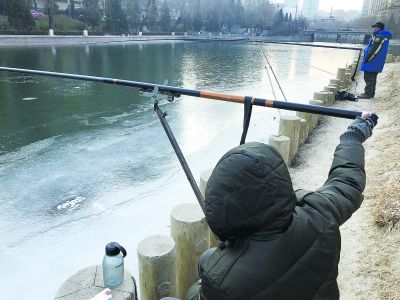 从此处继续向西,还有一群人刚从冰面上爬上岸,这是钓鱼的。冰面上被凿穿了几个洞,几位大叔在岸边架起了鱼竿。“收获一般,明儿得换地儿。”一边钓,一位大叔一边抱怨。一位网友“宴笑贱客”则在微博上发了一段视频,称在冬季竟有人在亮马河凿冰放生,同时担心人身安危。记者根据视频很快找到了事发地点,放生地位于燕莎桥东,两个冰窟窿赫然在目。