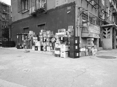 近日笔者来到朝阳区劲松一区。在小区东北角的114号楼东侧,一层住宅的墙壁上开了一处玻璃门,上百件大小不一的纸箱堆放在门前的空地上。和旁边同样结构的居民楼对比,这个快递站应该属于“开墙打洞”。笔者上前敲门,从屋里走出一名男士,他说这里只是负责投递从“天猫超市”订货后运送到这里的快递,他们只是一个中转站。