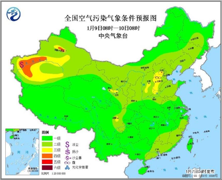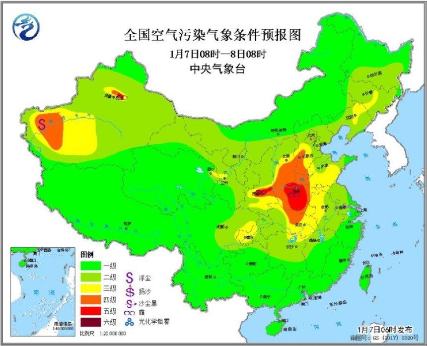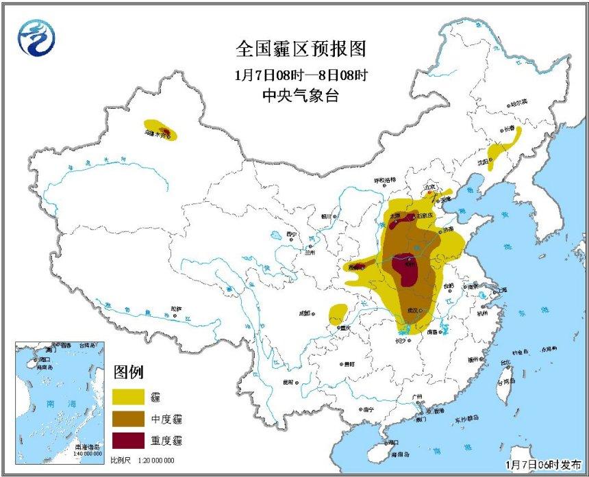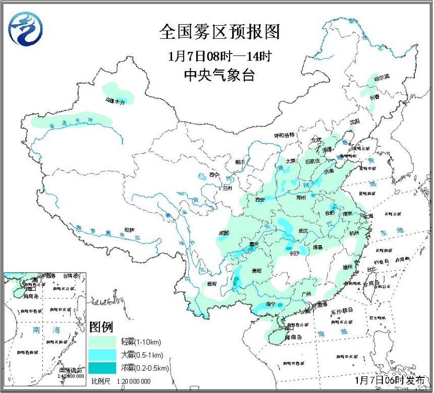 中新网1月7日电 据,气象台网站消息,7日白天,华北南部、黄淮、江淮西部、江汉、汾渭平原等地的大气扩散条件较差,将有轻至中度霾,江淮西部、江汉、汾渭平原等地的部分地区有重度霾天气。受冷空气和降水影响,7日至8日,上述地区的霾天气将自北向南逐渐减弱消散。9日至11日,大气扩散条件再次转差,有轻至中度霾。另外,7日上午,湖北南部、湖南北部、贵州西部、广西南部等地的部分地区有大雾。