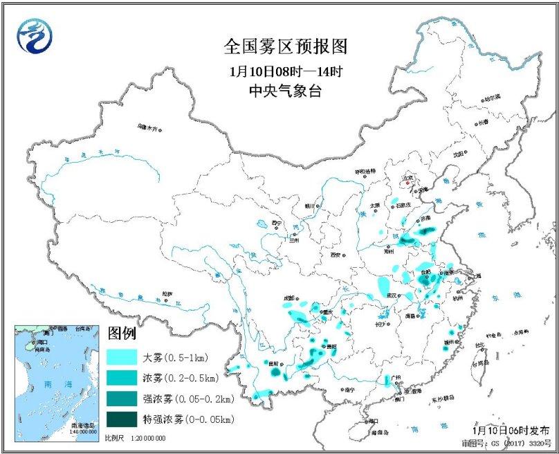 预计,1月10日早晨至上午,山东西南部、安徽中南部、云南中部、四川盆地南部、贵州南部、河南东南部等地的部分地区有大雾,局地有能见度不足200米的强浓雾(见图1)。,气象台于10日06时继续发布大雾预报。另外,11日至13日夜间至早晨,河北南部、山东中西部、河南中东部、苏皖等地部分地区有大雾。