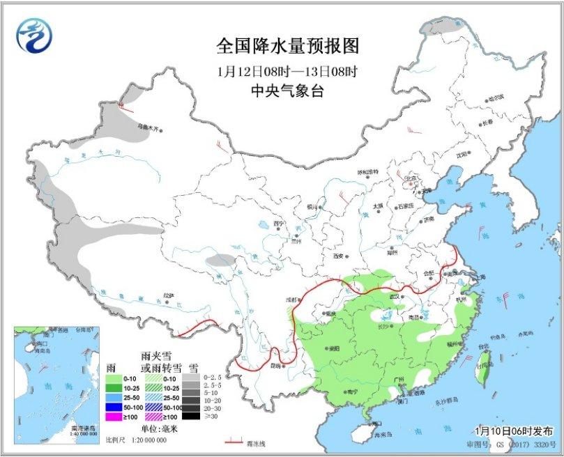 1月10日08时至11日08时,北疆北部、青海东南部、甘肃南部、河南中部和西南部、湖北西北部、川西高原南部等地的部分地区有小到中雪或雨夹雪;西南地区东部和南部、江汉南部、江淮、江南、华南中西部等地的部分地区有小到中雨,其中,广西北部、江西东北部局地有大雨(25~35毫米)。内蒙古中部、华北北部等地的部分地区有4~6级风(见图2)。