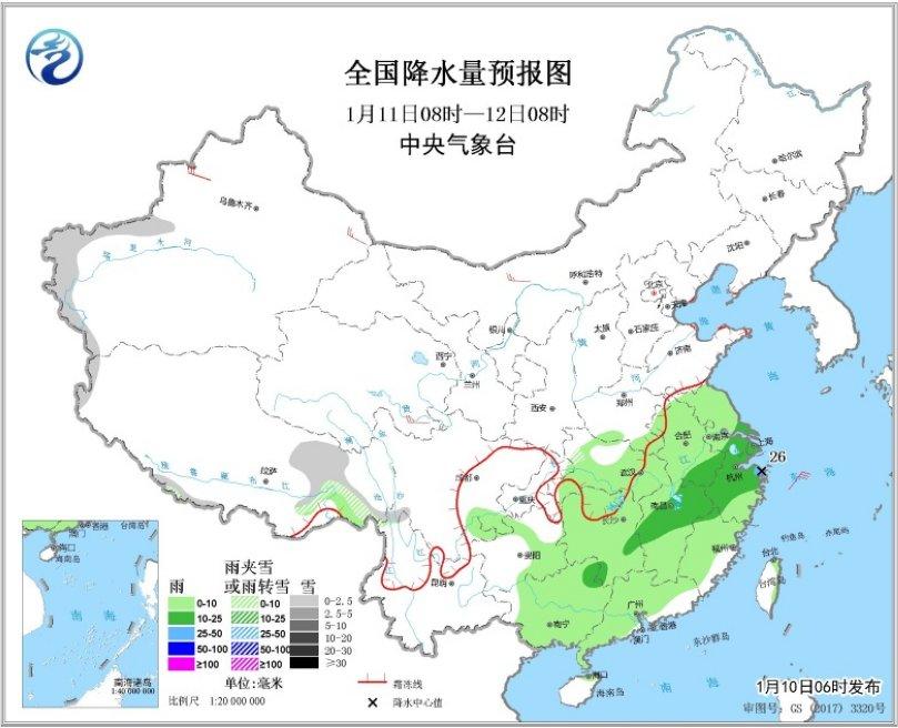 1月11日08时至12日08时,南疆西部山区、西藏东部等地的部分地区有小雪或雨夹雪;黄淮南部、江淮、江汉大部、江南、西南地区东南部、华南大部等地的部分地区有小到中雨,其中,浙江东北部局地有大雨(25~26毫米)。新疆北部、内蒙古西北部和青海南部等地的部分地区有4~6级风(见图3)。