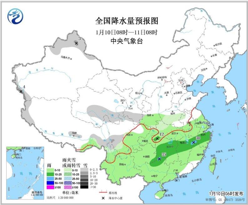 中新网1月10日电 据,气象台网站消息,昨日,山东南部、河南中东部、安徽北部、江苏北部等地降小到中雪,河南东部、安徽北部等地部分地区大雪(今5时,河南中东部积雪2~7厘米);湖北东北部、安徽南部、江苏南部降雪、雨或雨夹雪4~15毫米;广西西部、湖南东北部、江西北部、浙江西北部等地降中雨,局地大雨。