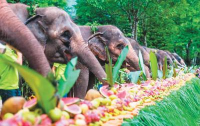 云南省西双版纳傣族自治州野象谷景区,大象在吃象餐。