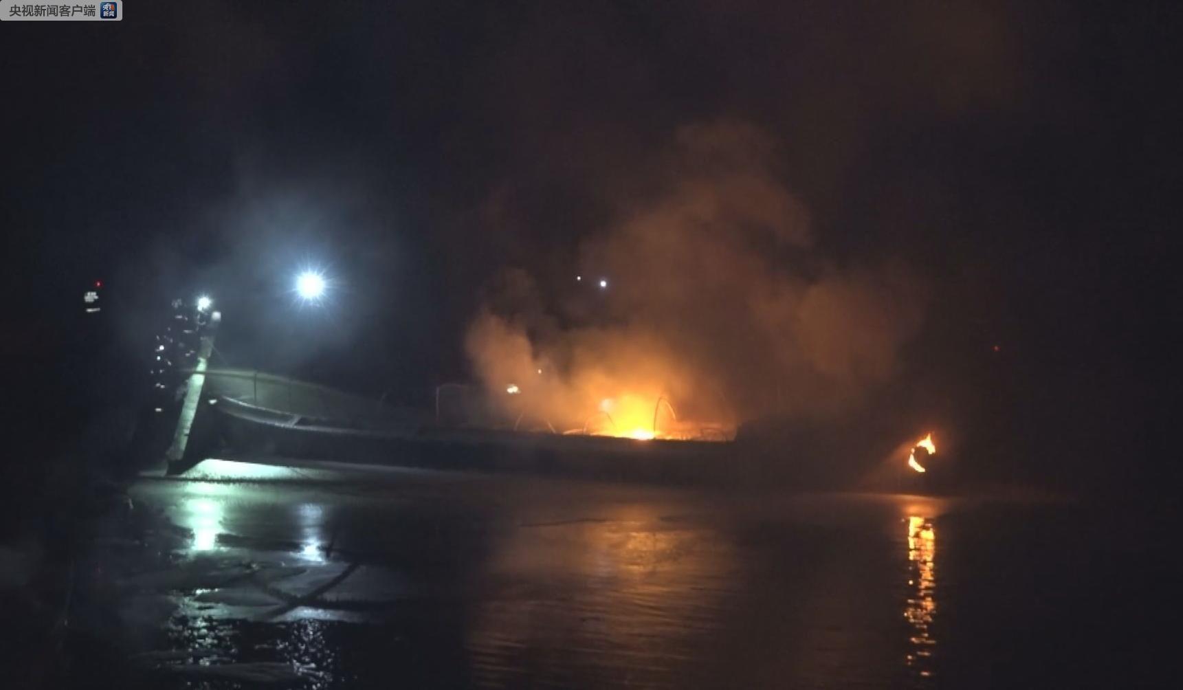 1日晚21时30分消防救援队到达事故现场,经侦察发现河道内一船只正燃烧着熊熊大火,冒出滚滚浓烟,且火势处于猛烈燃烧阶段,燃烧的船只已经顺着水流移动至河岸边,将岸边停靠的一条渔船引燃。