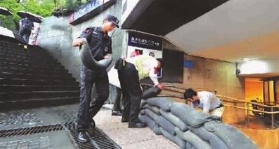 ■ 在南京东路步行街新世界下沉式广场,防汛人员搬运沙袋筑坝,防止雨水倒灌 杨建正 摄