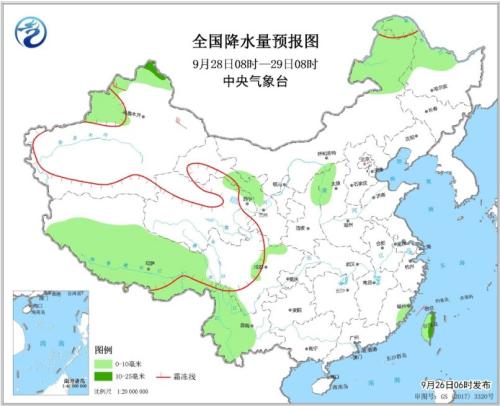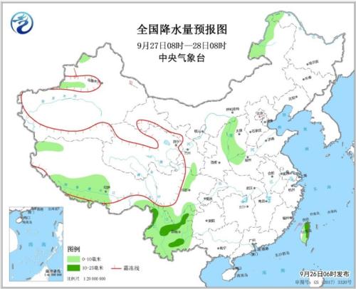 9月27日8时至28日8时,内蒙古东北部、山西中西部、陕东北部、四川盆地西北部和南部、云南大部、贵州西北部、新疆伊犁河谷、西藏南部和台湾岛东部等地的部分地区有小雨,其中,云南西北部和东部、台湾岛东部局地中雨。新疆北部有4~5级风。东海南部偏南海域海域、台湾海峡将有5~6级、阵风7级的东北风。