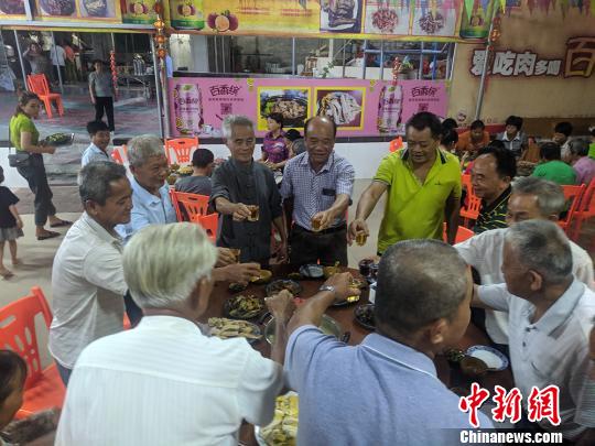 “上菜喽,上菜喽……”下午6点,宴会准时开始,白切鸡、白切鸭、焖羊肉……一道道可口的佳肴摆满了桌子,老人们一边吃一边聊,开怀之处,笑如孩童,合不拢嘴。